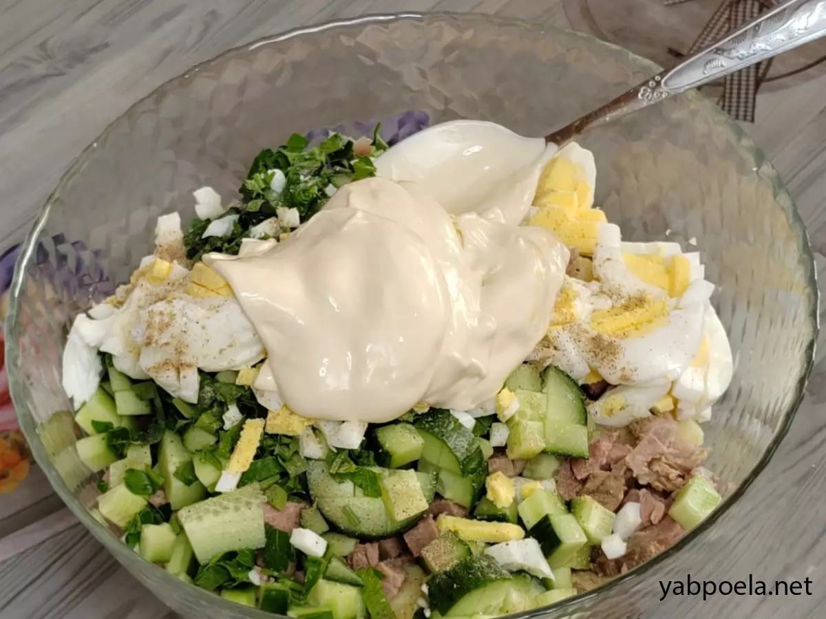 Додайте сіль за смаком (враховуючи, що м'ясо вже солили під час варіння) та чорний мелений перець. Додайте 3–4 столові ложки майонезу.