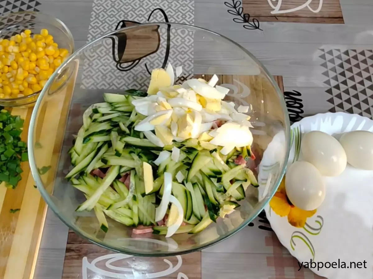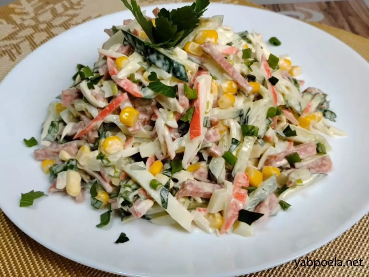 Цей салат — справжня знахідка, коли потрібно приготувати щось яскраве та смачне всього за 10 хвилин. Поки варяться яйця, ви встигнете нарізати всі інші інгредієнти. Невеликий секрет у вигляді копченої ковбаски робить його смак більш насиченим та цікавим. Салат виходить соковитим, свіжим і завжди першим зникає зі столу!