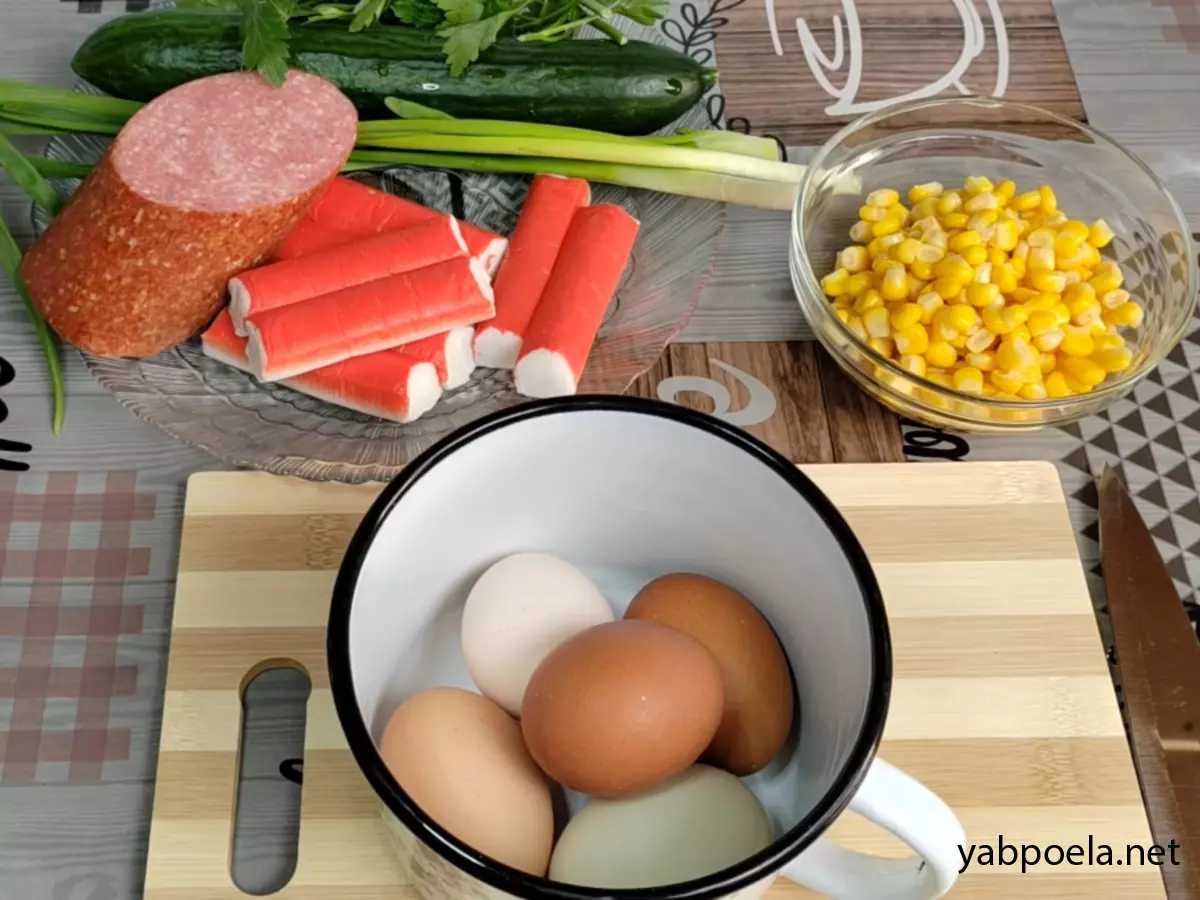 Насамперед поставте варитися 5 яєць. Залийте їх холодною водою і після закипання варіть 8 хвилин. Поки яйця на плиті, підготовлюємо все інше.