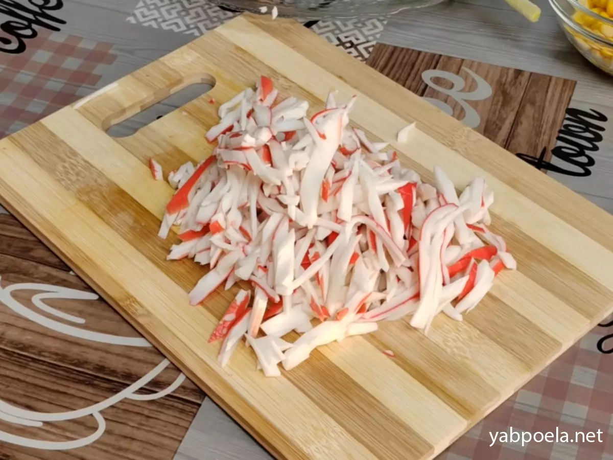 Візьміть крабові палички (200 г). Розріжте кожну на три частини, а потім наріжте навскоси соломкою.