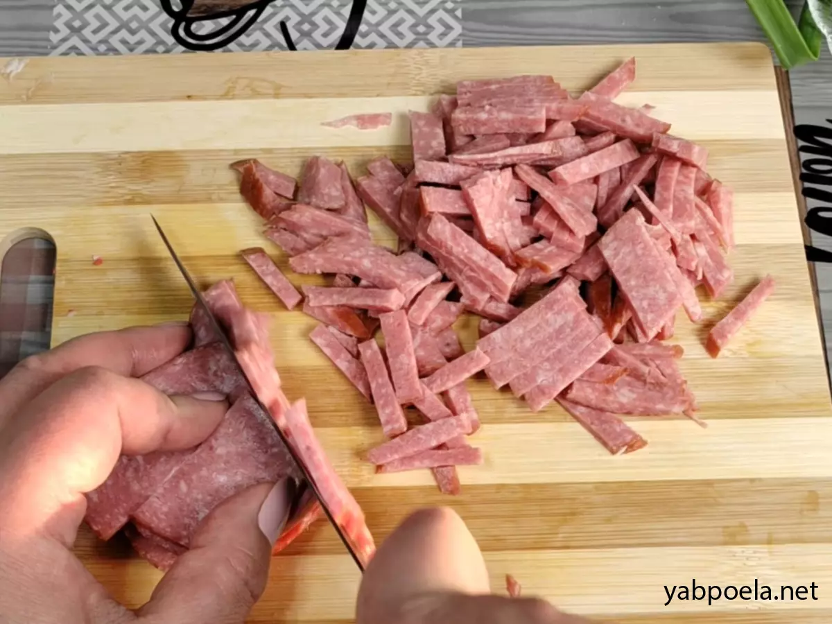 Додайте "секретний інгредієнт" — варено-копчену ковбасу (200 г). Розріжте її навпіл, щоб соломка не була занадто довгою, і також наріжте тонкими смужками.