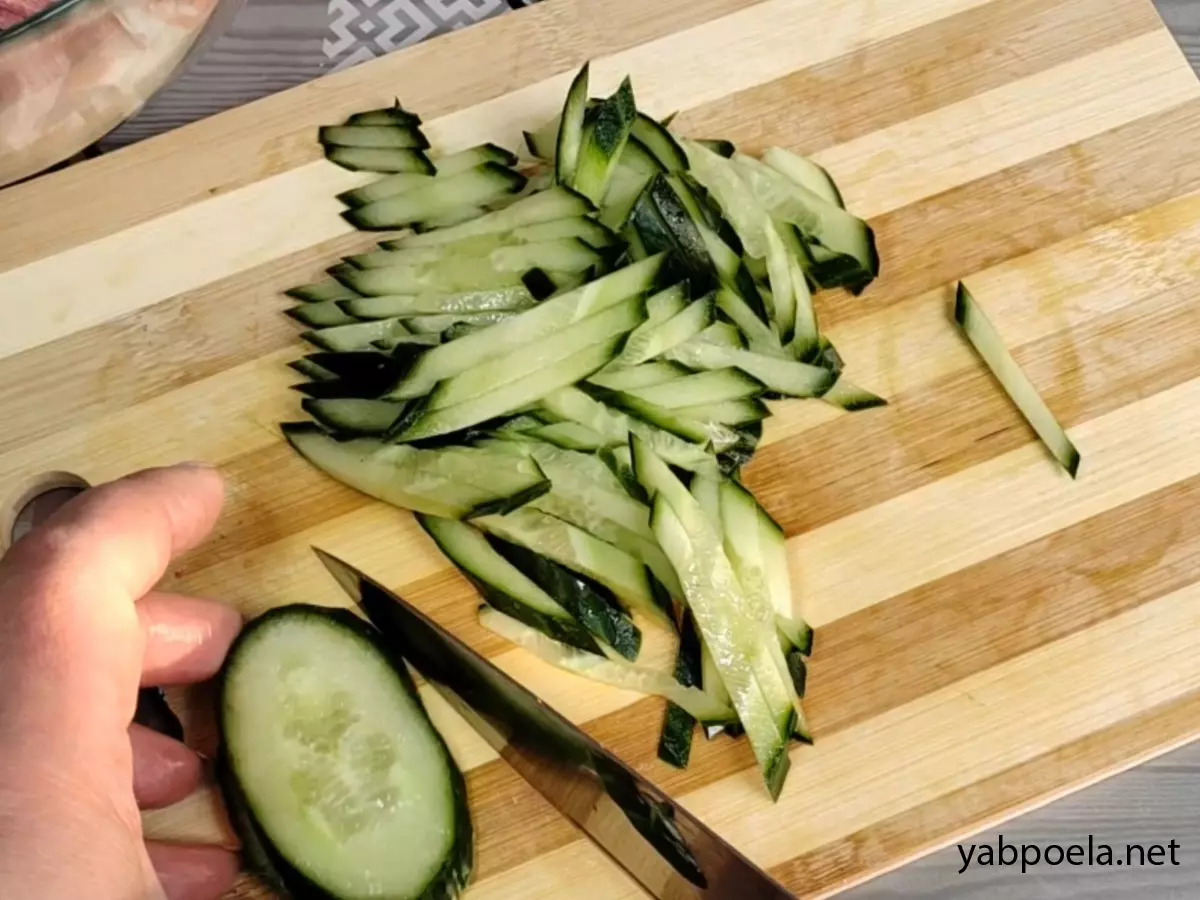 Свіжий огірок (150–200 г) наріжте акуратною соломкою. Огірок додасть салату приємного хрускоту та свіжості.