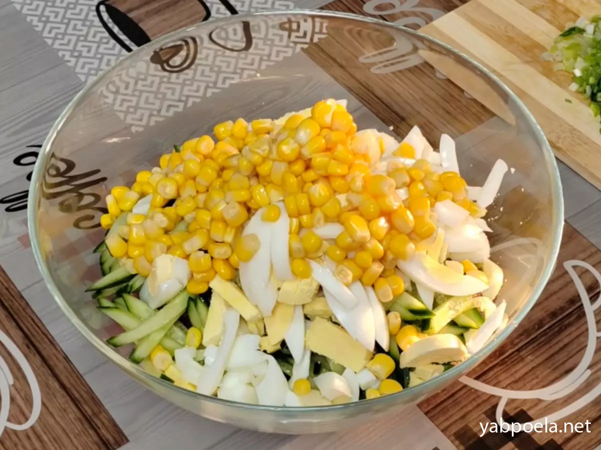 Додайте в салатник консервовану кукурудзу (100–120 г). Кількість регулюйте за смаком.
