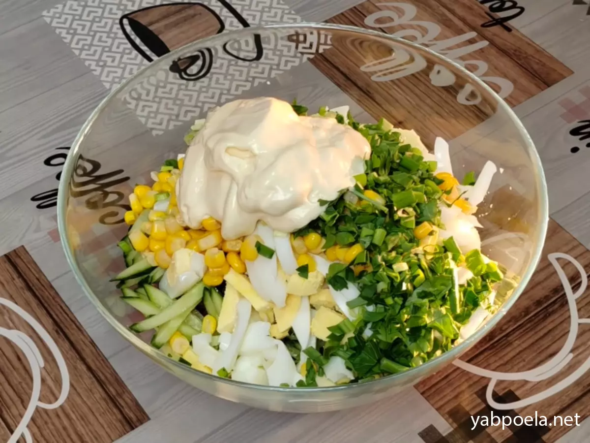 Посоліть і поперчіть салат. Додайте нарізану зелень, 3 повні столові ложки майонезу і добре перемішайте. Спробуйте на смак і за потреби додайте ще спецій. Салат готовий!