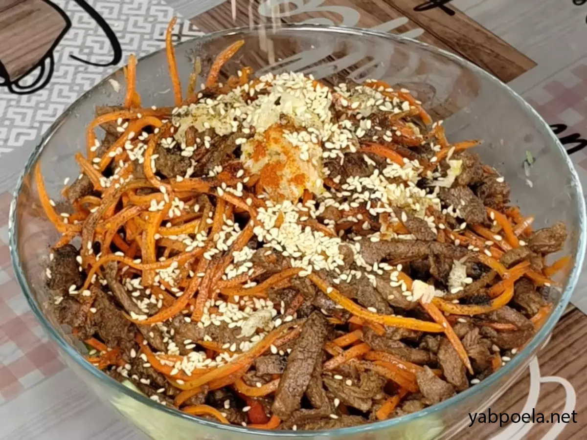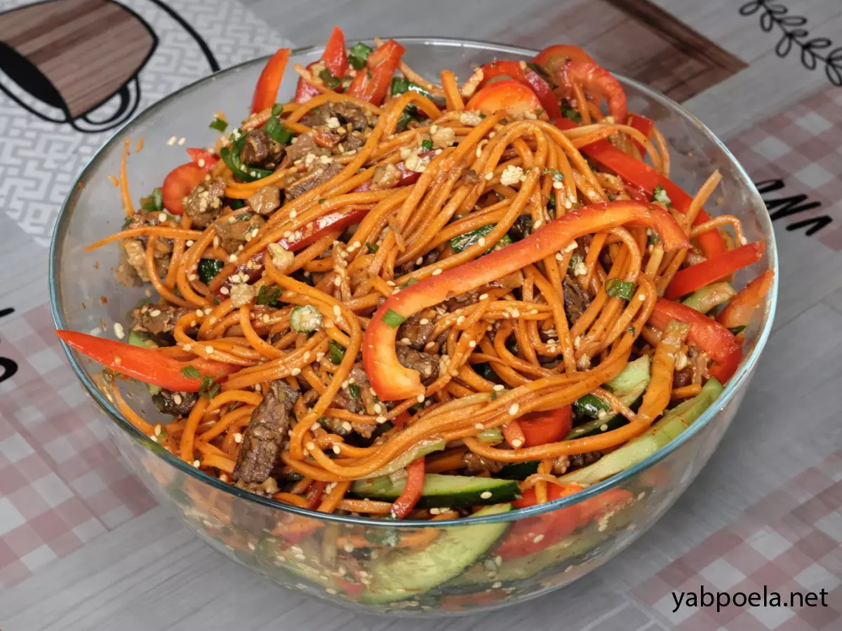 Цей салат в азійському стилі — один із моїх найулюбленіших! Він виходить неймовірно яскравим, хрустким і дуже смачним. Завдяки поєднанню соковитої обсмаженої яловичини та свіжих овочів, страва виходить одночасно ситною та легкою. Секрет його «бомбічного» смаку криється у пікантній заправці з соєвим соусом та ароматі обсмаженого кунжуту. Такий салат обов'язково вразить ваших гостей, і будьте готові до того, що вони точно проситимуть рецепт!