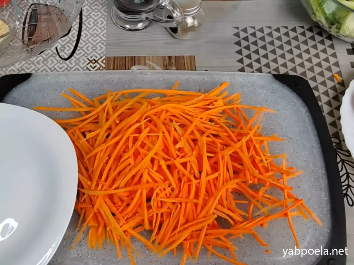 Візьміть моркву (2 шт.) і натріть її довгою тонкою соломкою на спеціальній тертці або наріжте вручну. Поки відкладіть убік.