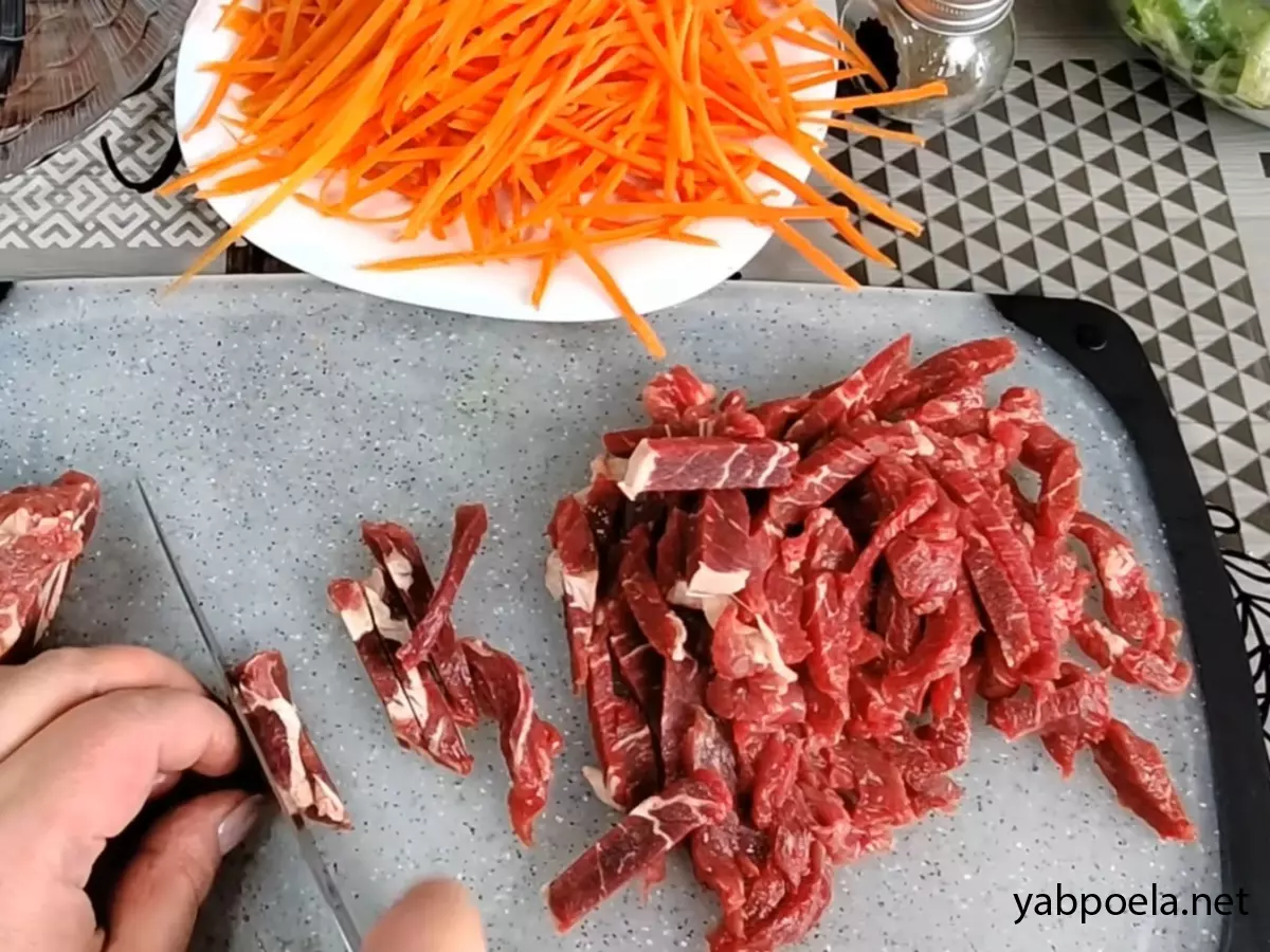 Підготуйте м'ясо. Яловичину (500 г) наріжте тонкими смужками, бажано поперек волокон — так вона швидше приготується і буде м'якшою.
