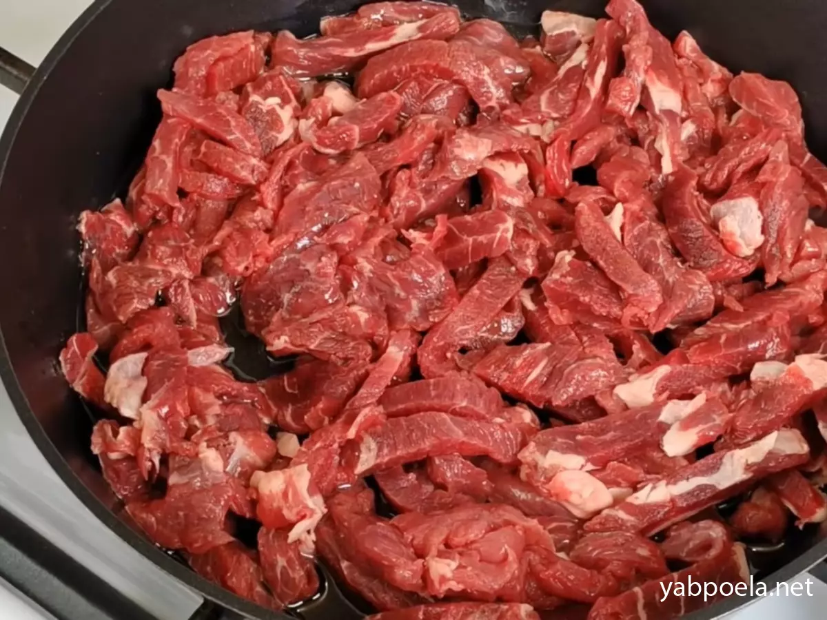 Розігрійте сковорідку з 5–6 ст. л. рослинної олії. Викладіть м'ясо і смажте до готовності. Якщо м'ясо жорстке, долийте трохи води і протушкуйте до м'якості, поки рідина не випарується і м'ясо не почне підсмажуватися до золотистого кольору.