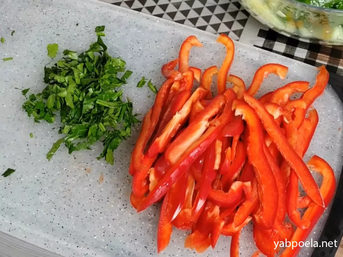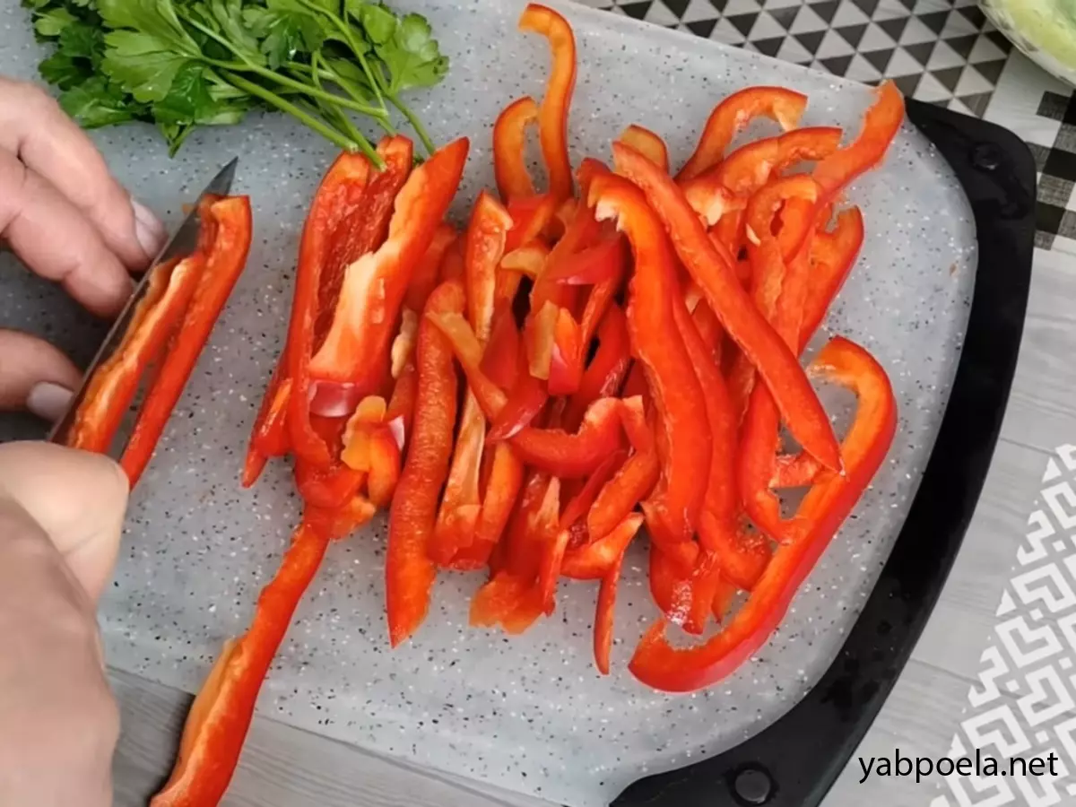 Поки смажиться м'ясо, наріжте болгарський перець тонкою соломкою.