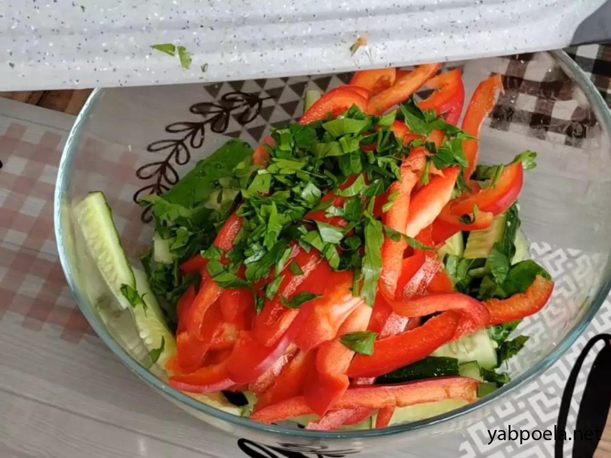 Поверніться до огірків: злийте весь сік, що утворився, він нам не знадобиться. До огірків додайте нарізаний перець та зелень.