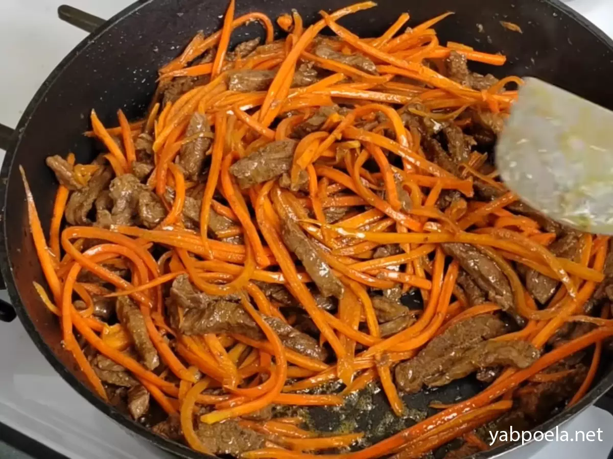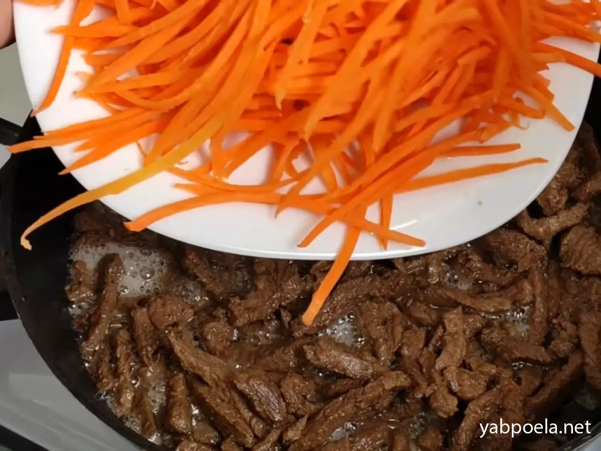 Коли м'ясо підсмажиться, відправте до нього в сковорідку моркву. Перемішайте і прогрійте все разом 3–4 хвилини, щоб морква стала м'якою (смажити до хрускоту не потрібно).