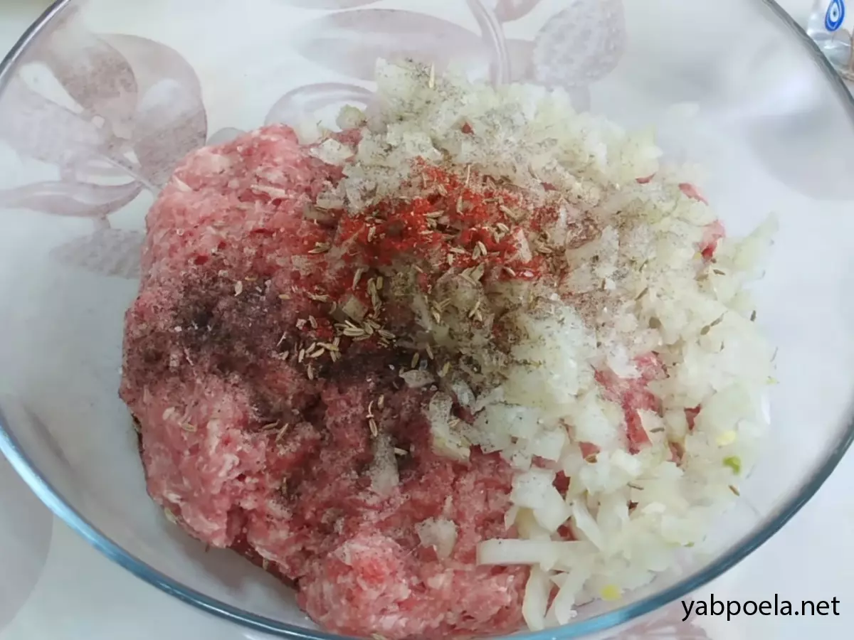 Дрібно наріжте цибулину та додайте її до фаршу. Посоліть, поперчіть, додайте паприку та зіру (обов’язково розітріть насіння в руках, щоб розкрити аромат). Якщо фарш густий, влийте трохи води і ретельно вимішайте до однорідності.