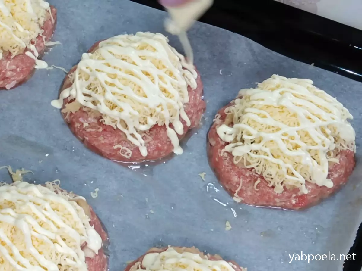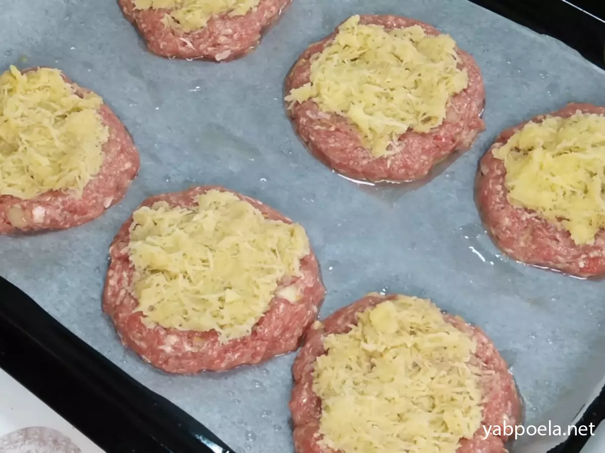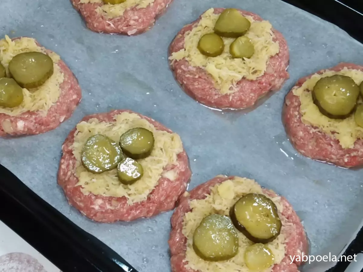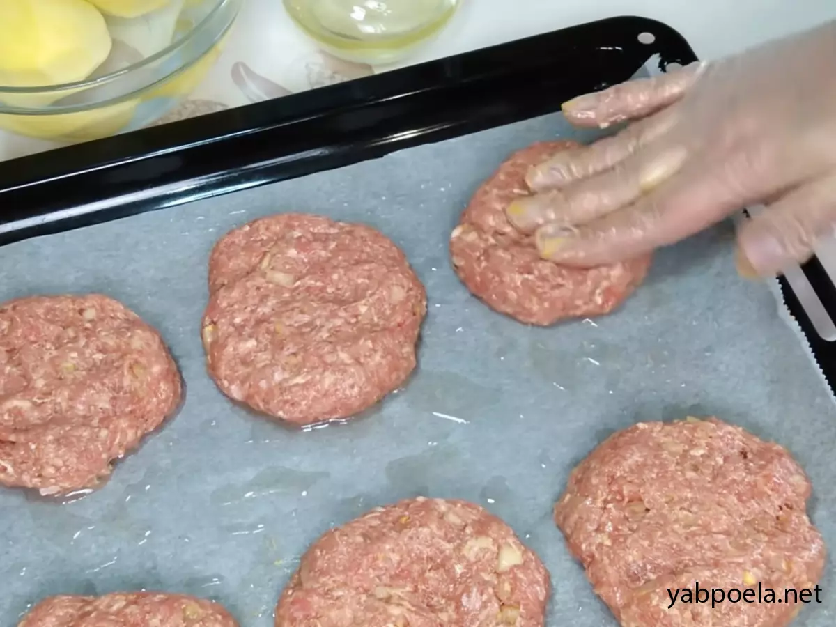 Деко застеліть пергаментом і змастіть олією. Розділіть фарш на 6 рівних частин (приблизно по 100–120 г). Сформуйте круглі котлети і викладіть на деко, злегка притиснувши, щоб вийшов плаский «майданчик» для начинки.