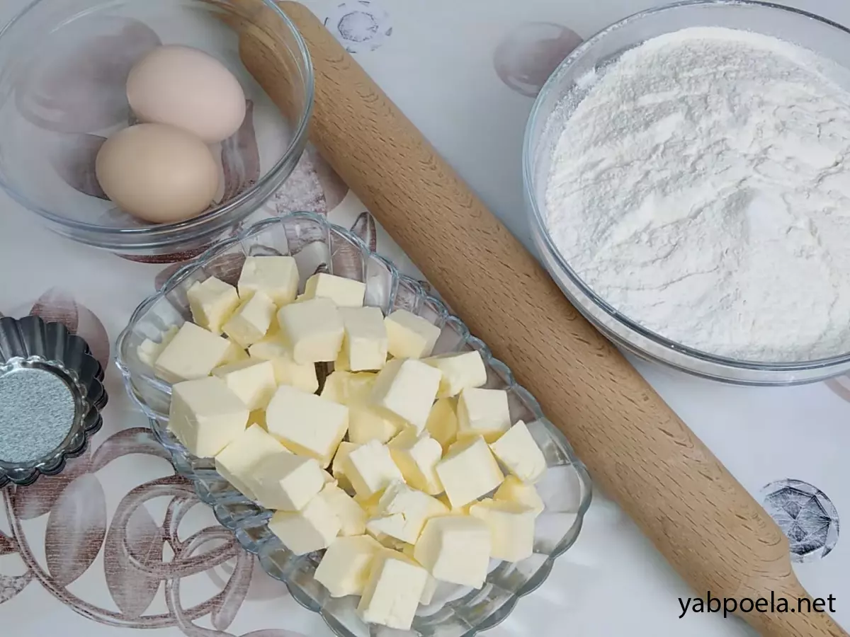 Підготуйте всі необхідні інгредієнти та інструменти. Нам знадобиться просіяне борошно, м'яке вершкове масло, нарізане кубиками, яйця, сіль та цукор. Також підготуйте качалку та металеві формочки для тарталеток.