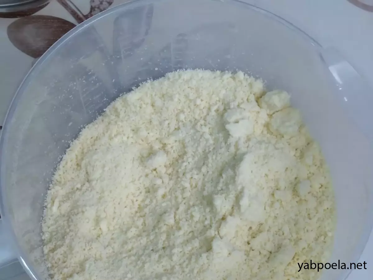 Просіяне борошно (400 г) змішайте з м'яким вершковим маслом (200 г). Розтирайте їх у крихту за допомогою міксера або руками. Крихта має вийти легкою та повітряною, схожою на хлібну.