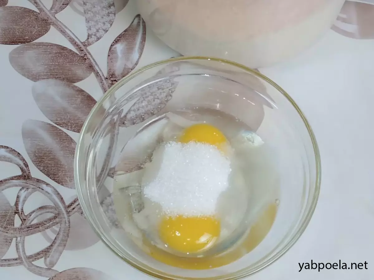 В окремій ємності з’єднайте 2 яйця, сіль та цукор. Ретельно перемішайте (збивати не потрібно), щоб кристали солі та цукру повністю розчинилися.