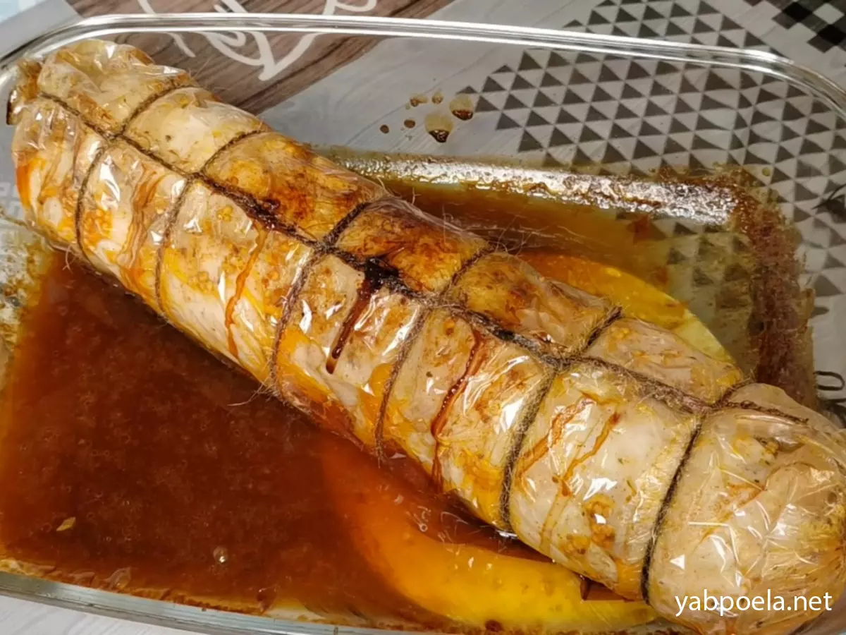 Покладіть рулет у форму швом (місцем завороту плівки) догори, щоб сік не витікав і м'ясо тушкувалося в ньому. Запікайте в духовці при 180°C протягом 1 години 15 – 1 години 20 хвилин.