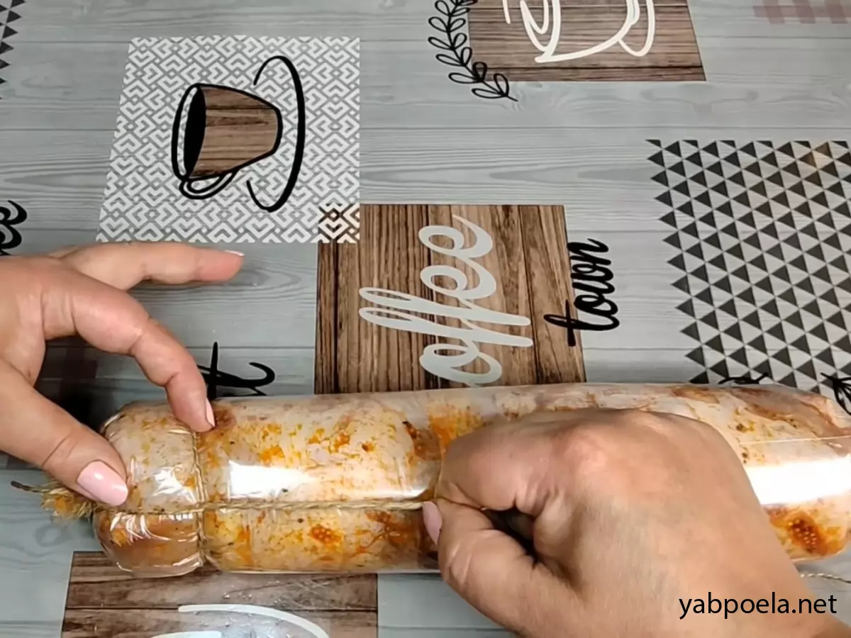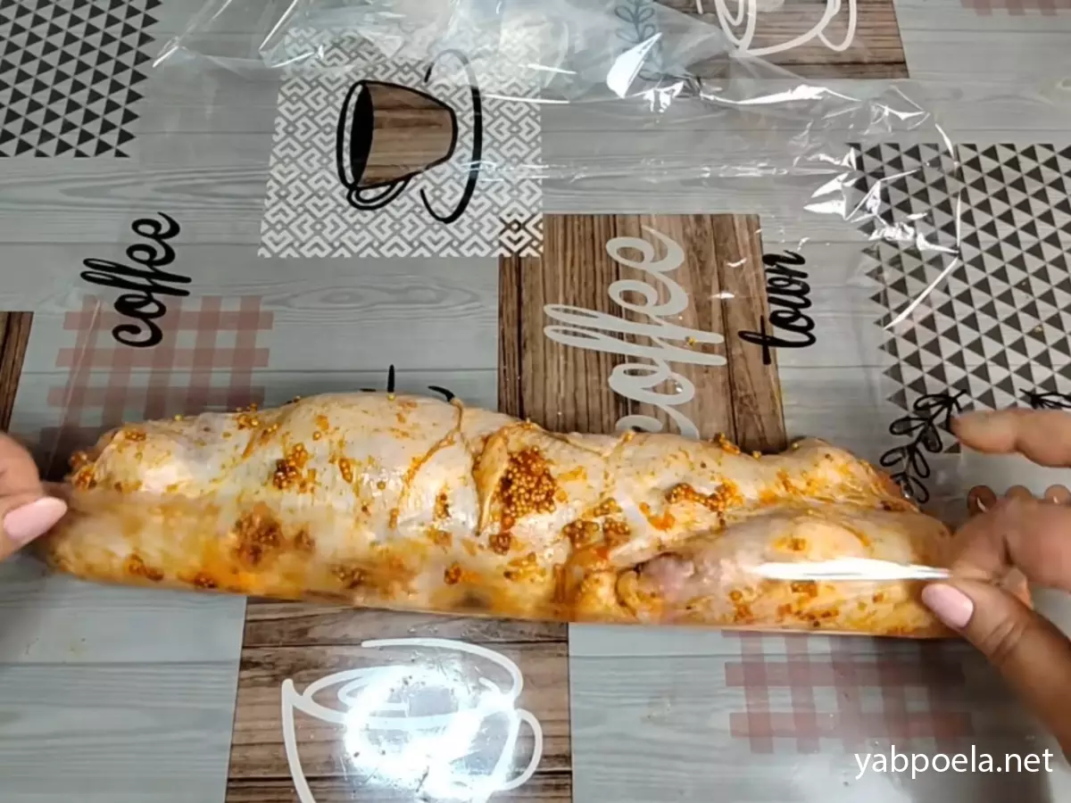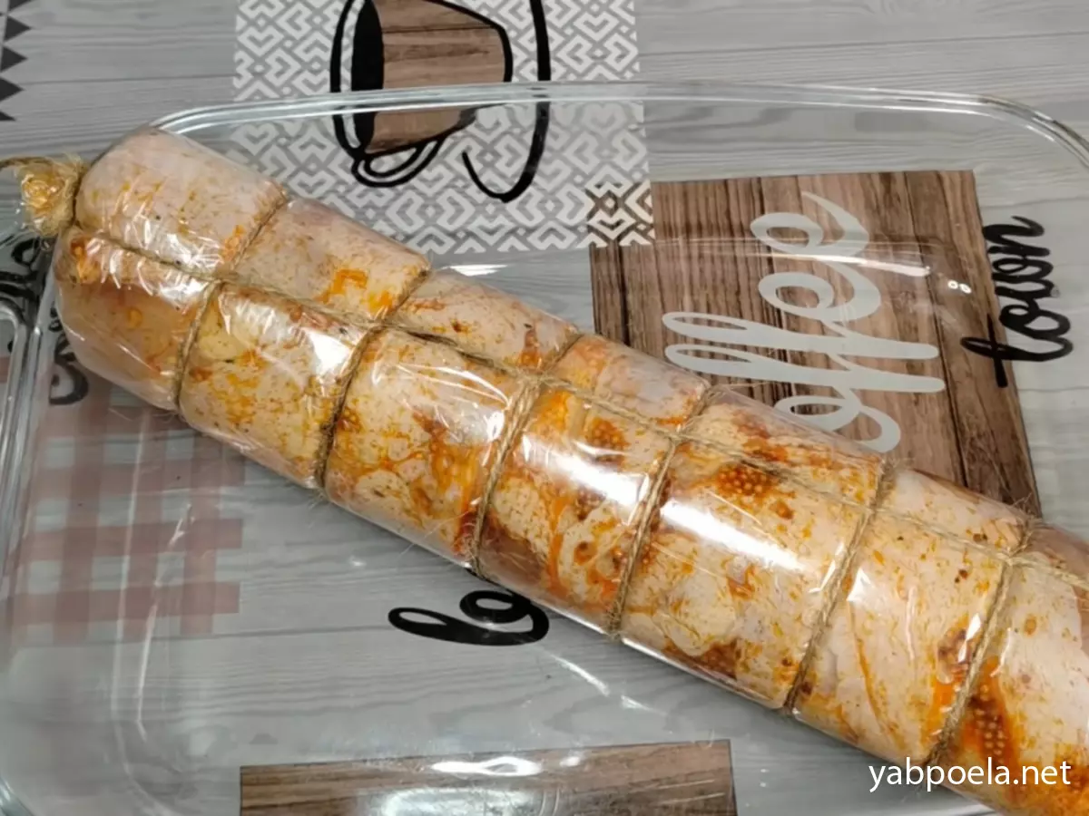 Змішайте інгредієнти для обмазки: гірчицю, тертий часник, паприку та олію. Добре натріть рулет зовні. Помістіть його на шматок рукава (пакета) для запікання (приблизно 40 см завдовжки) і щільно загорніть, як «цукерку», зав'язавши краї нитками.