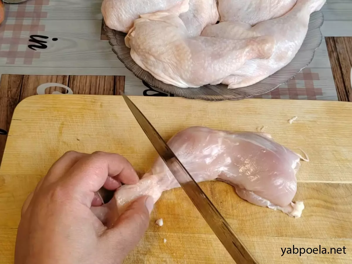 Зніміть м'ясо з кісток лише від 4-х окорочків. Інші 4 очищені окорочки (м'ясо на кістці) відкладіть — вони знадобляться для іншої страви. Зняте м'ясо наріжте вручну дрібним кубиком. Рублений фарш виходить набагато соковитішим.
