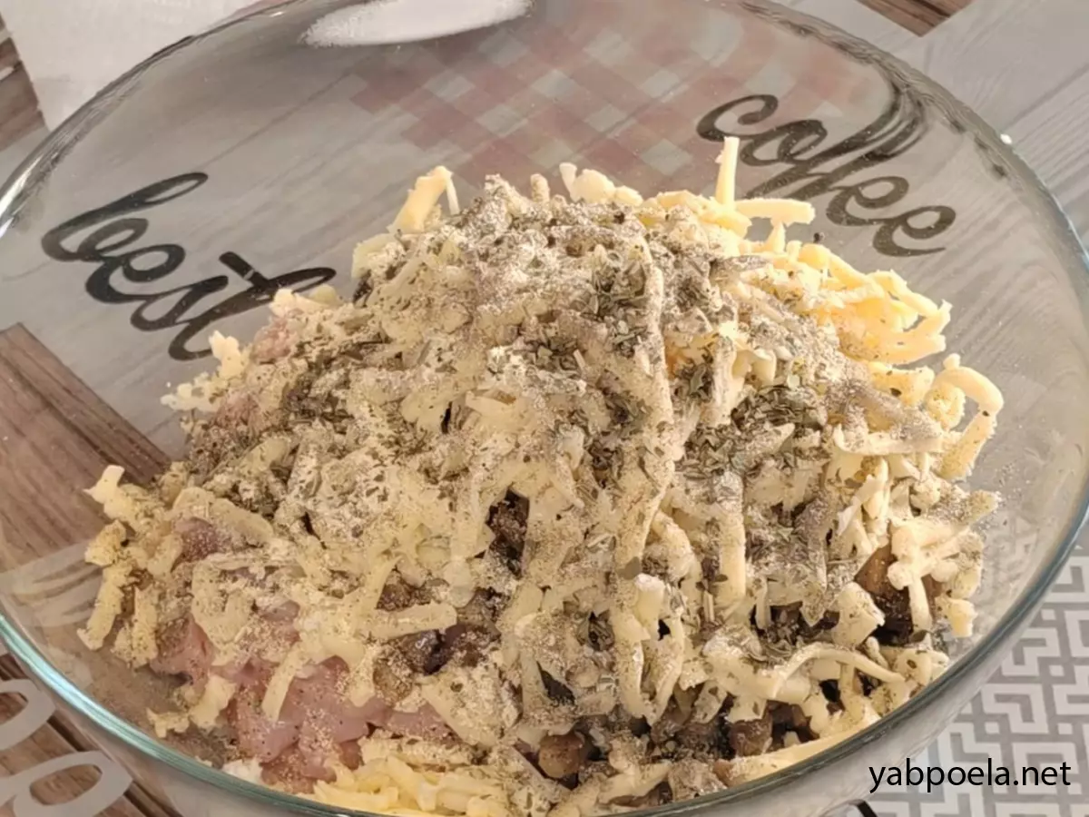 Змішайте рублене м'ясо (від 4-х окорочків), охололі гриби з цибулею та натертий сир (100 г). Додайте спеції. Цієї кількості начинки ідеально вистачить, щоб нафарширувати всі 8 підготовлених «панчох».