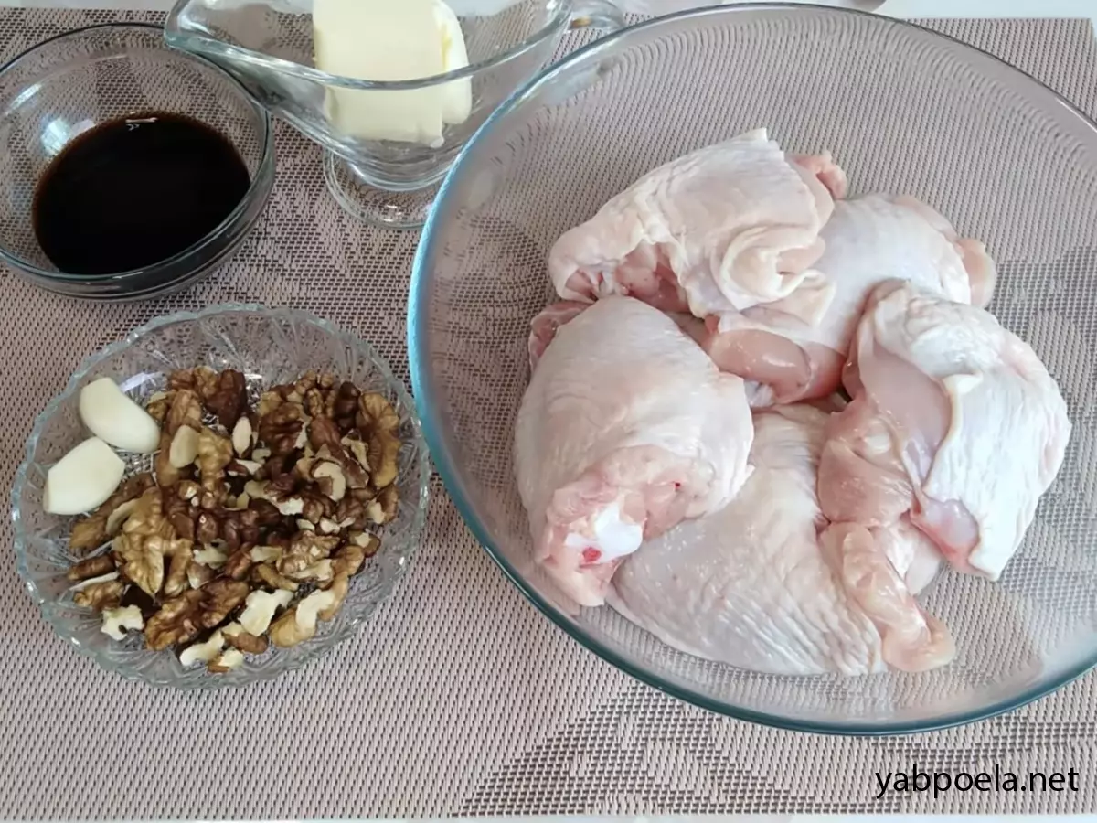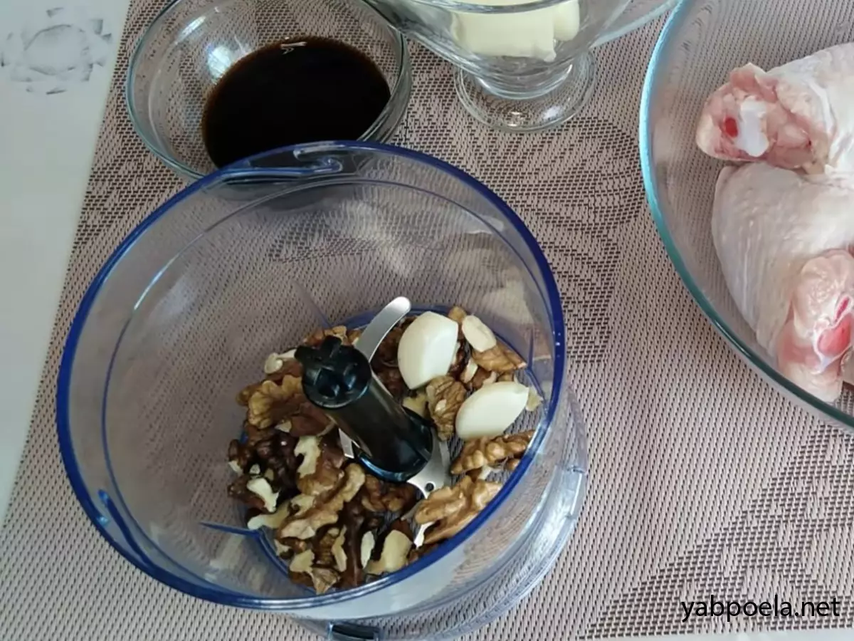 Зберіть усі інгредієнти для приготування: курячі стегенця, волоські горіхи, часник, вершкове масло, соєвий соус та спеції (коріандр, тім'ян, сіль та перець). Також підготуйте блендер для подрібнення горіхів.