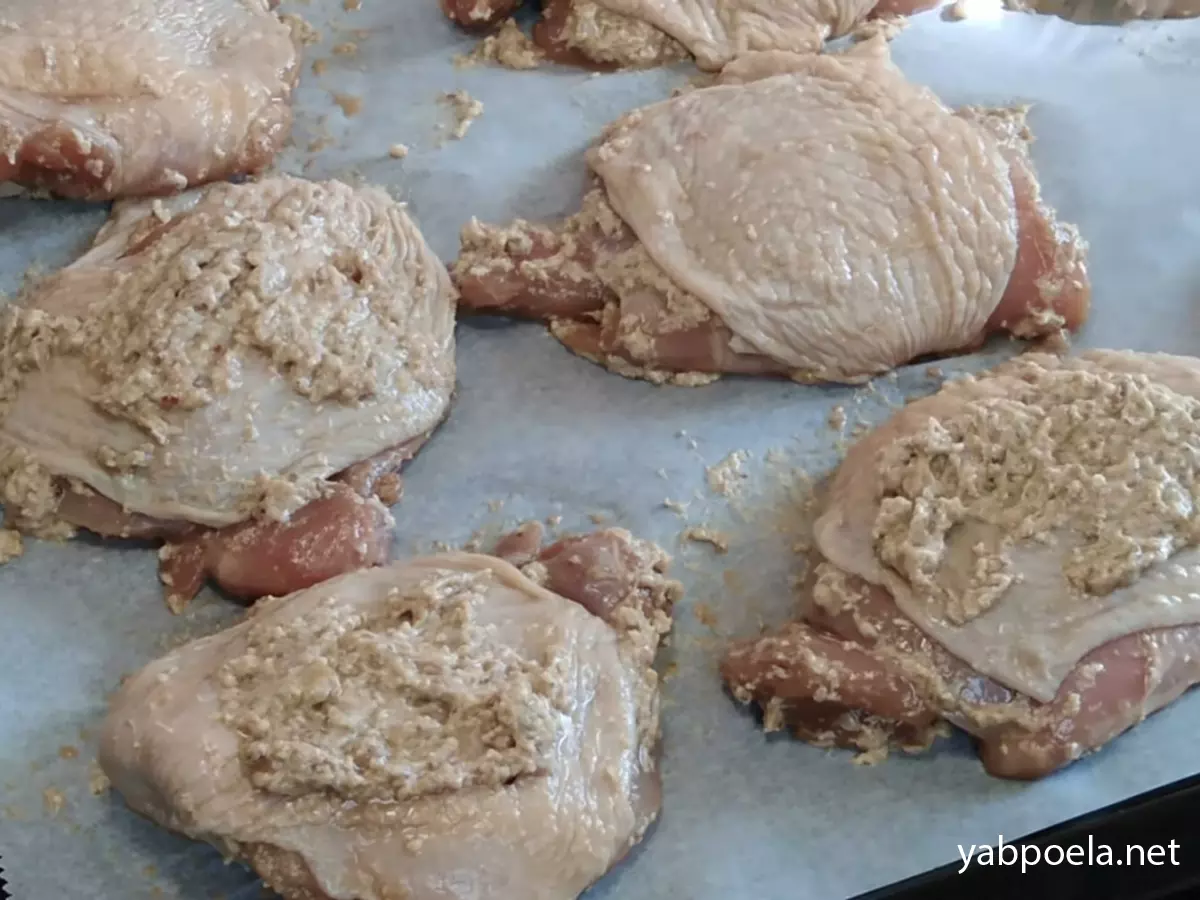 Обов'язково зберіть залишки горіхового соусу з миски та розподіліть їх зверху на кожен шматочок курки. При запіканні горішки підсмажаться і створять апетитну скоринку.