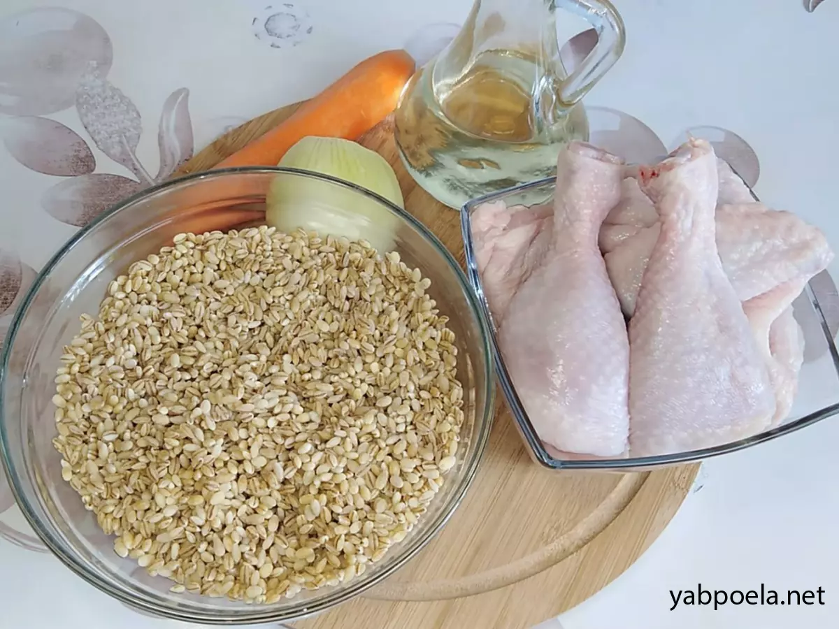 Зберіть усі необхідні інгредієнти: перлову крупу, шматочки курки, цибулю, моркву, набір спецій та вершкове масло. Підготуйте форму для запікання.