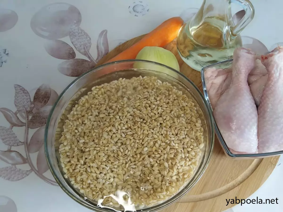 Перлову крупу ретельно промийте. Якщо є час, залийте її водою на 2–3 години для набухання. Якщо часу немає — залийте її водою хоча б на той час, поки займаєтеся куркою та овочами.
