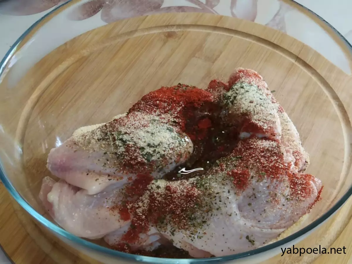 Замаринуйте курку (600 г). Додайте до м'яса сіль, суміш перців, сушену кінзу, паприку, сушений часник та 1 ст. л. соняшникової олії. Добре перемішайте, щоб спеції розподілилися рівномірно.
