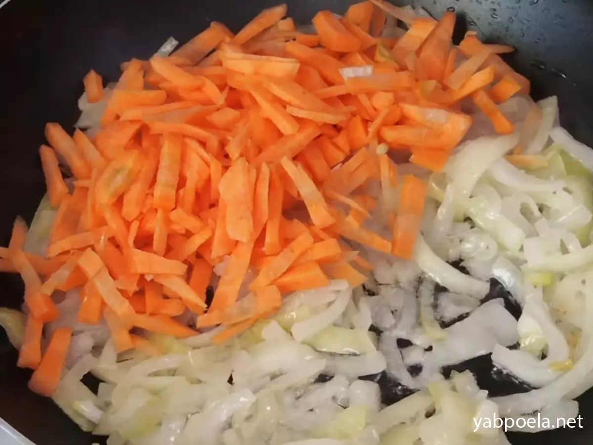 Цибулю та моркву наріжте так, як вам більше подобається (дрібніше або крупніше). Обсмажте цибулю на олії до прозорості, потім додайте моркву та смажте до золотистого кольору.