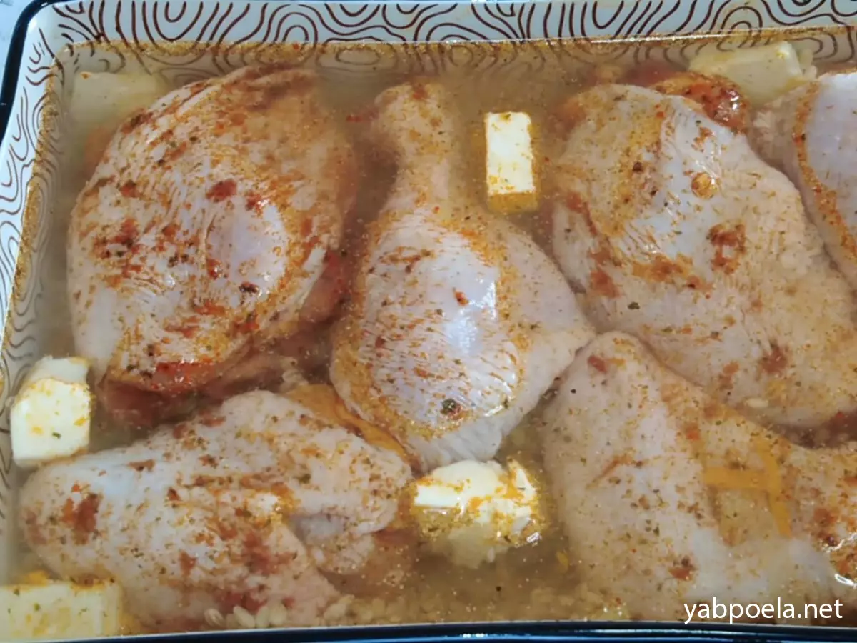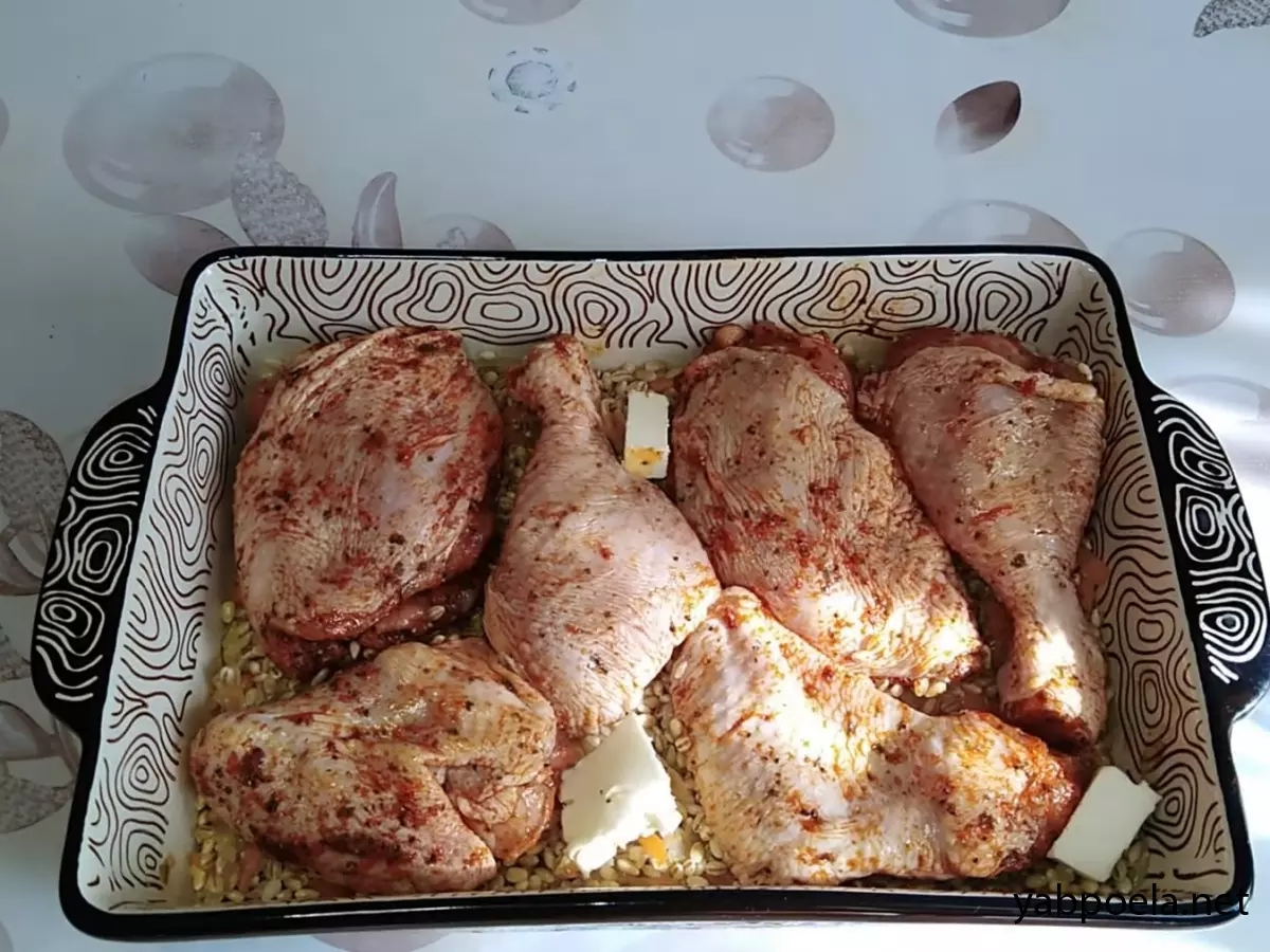 Зверху на шар перловки з овочами викладіть замариновані шматочки курки. Зверху на курку додайте кілька невеликих шматочків вершкового масла — це зробить страву ніжнішою.
