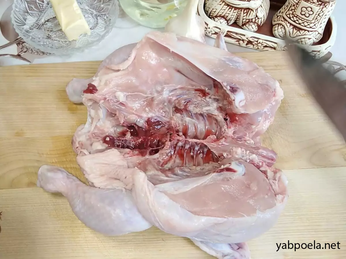 Підготуйте тушку. Розріжте курча по центру грудки навпіл і розкрийте як книжку. Обов'язково видаліть легені, зріжте зайвий жир, гузку і все, що вам не подобається. Ретельно промийте тушку під холодною проточною водою.