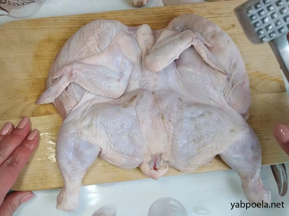 Щоб курча просмажилося рівномірно, його потрібно зробити пласким. Злегка відбийте тушку молотком (без фанатизму, по 2–3 удари). Найголовніше — перебити суглоби біля ніжок та крил, щоб вони не стовбурчилися, і тушка лягла на сковороду рівно.