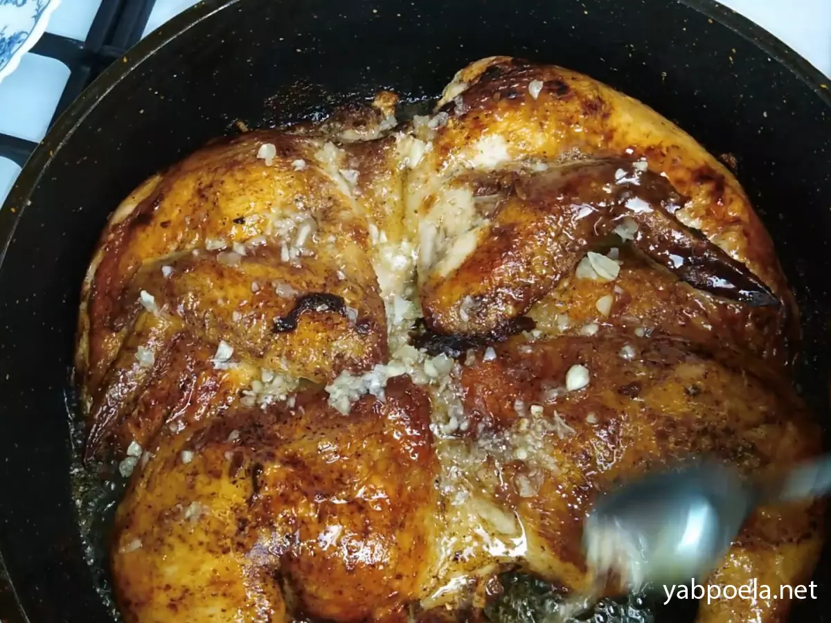 До речі, якщо вам сподобався цей спосіб приготування цілої тушки, але наступного разу захочеться чогось більш солодкувато-пряного, спробуйте курку запечену в глазурі. Там замість часникового преса використовується ароматна суміш із джемом, яка карамелізується під час запікання.