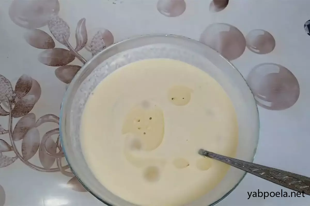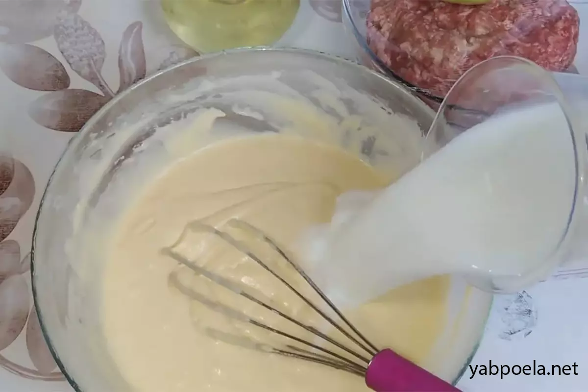 У глибоку миску розбийте 3 яйця, додайте 4 ч. л. цукру та 1 ч. л. солі (неповну, без гірки). Влийте приблизно половину рідини (суміш молока та води). Перемішайте.