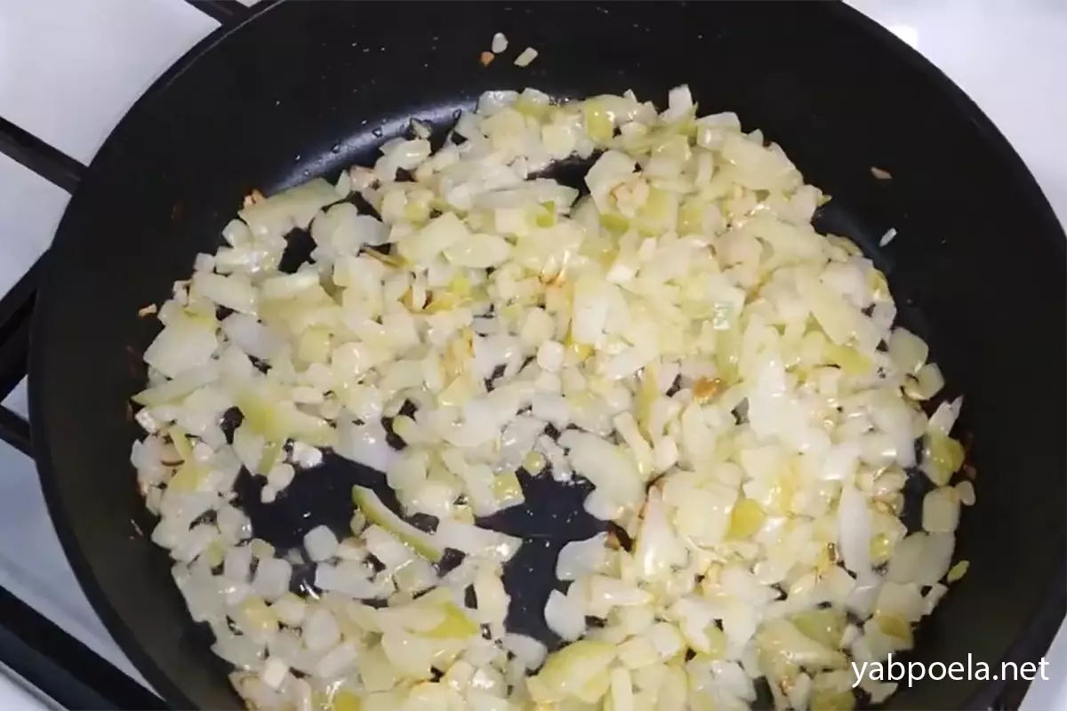 Готуємо начинку. Цибулю наріжте кубиком і обсмажте на сковороді до золотистого кольору.