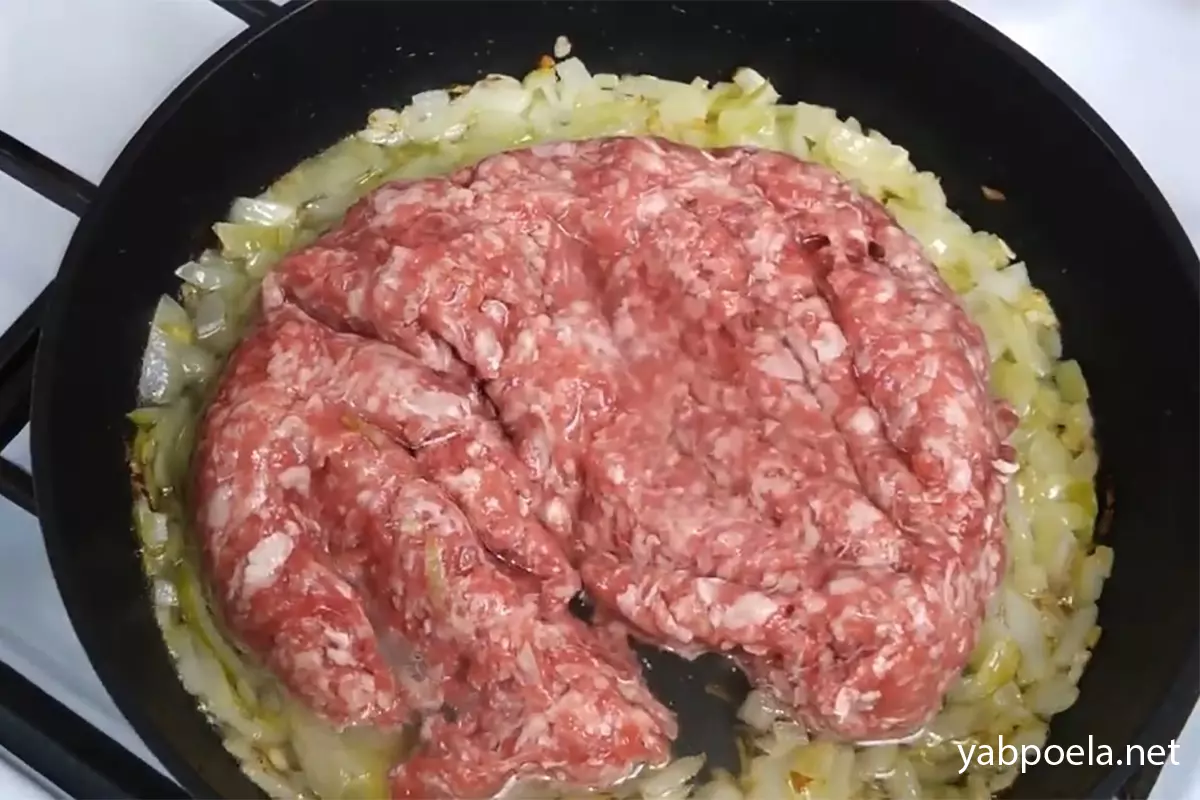 До цибулі додайте м'ясний фарш. Відразу влийте півсклянки води. Перемішайте.