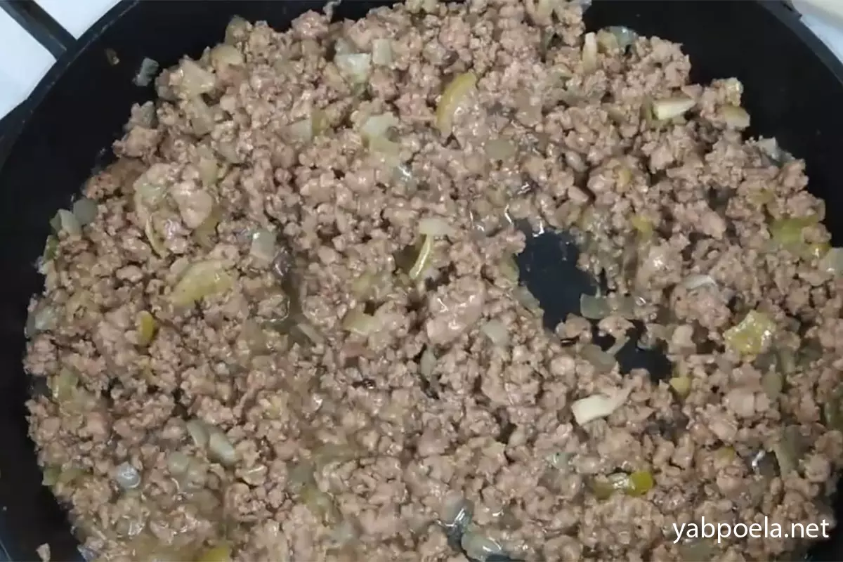 Тушкуйте фарш, поки вся рідина не випарується. Наприкінці додайте сіль та чорний мелений перець за смаком. Начинка готова.