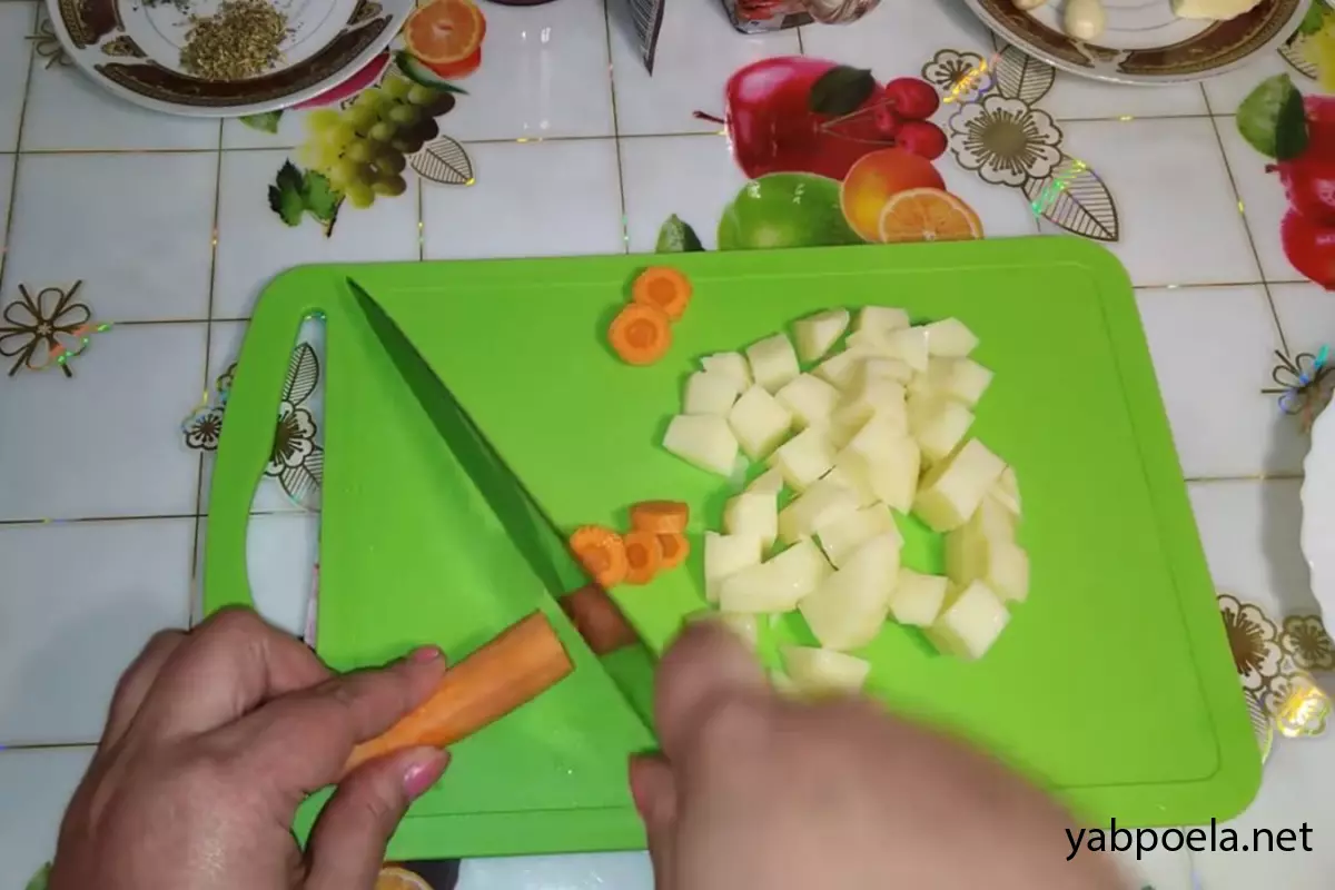 Підготуємо овочі. Нарізка може бути довільною, оскільки наприкінці ми все будемо подрібнювати блендером. Цибулю нарізаємо кубиком, моркву — кружальцями або півкружальцями, картоплю — невеликим кубиком. Помідор нарізаємо довільно.