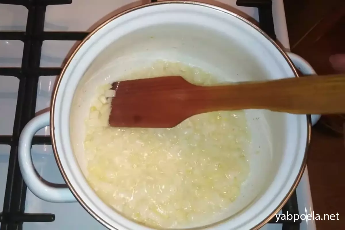Для супу найкраще підійде каструля з товстим дном (1,5–2 літри). Розігріваємо в ній рослинну олію (3 ст. л.). Відправляємо цибулю обсмажуватися до прозорості (пару хвилин).