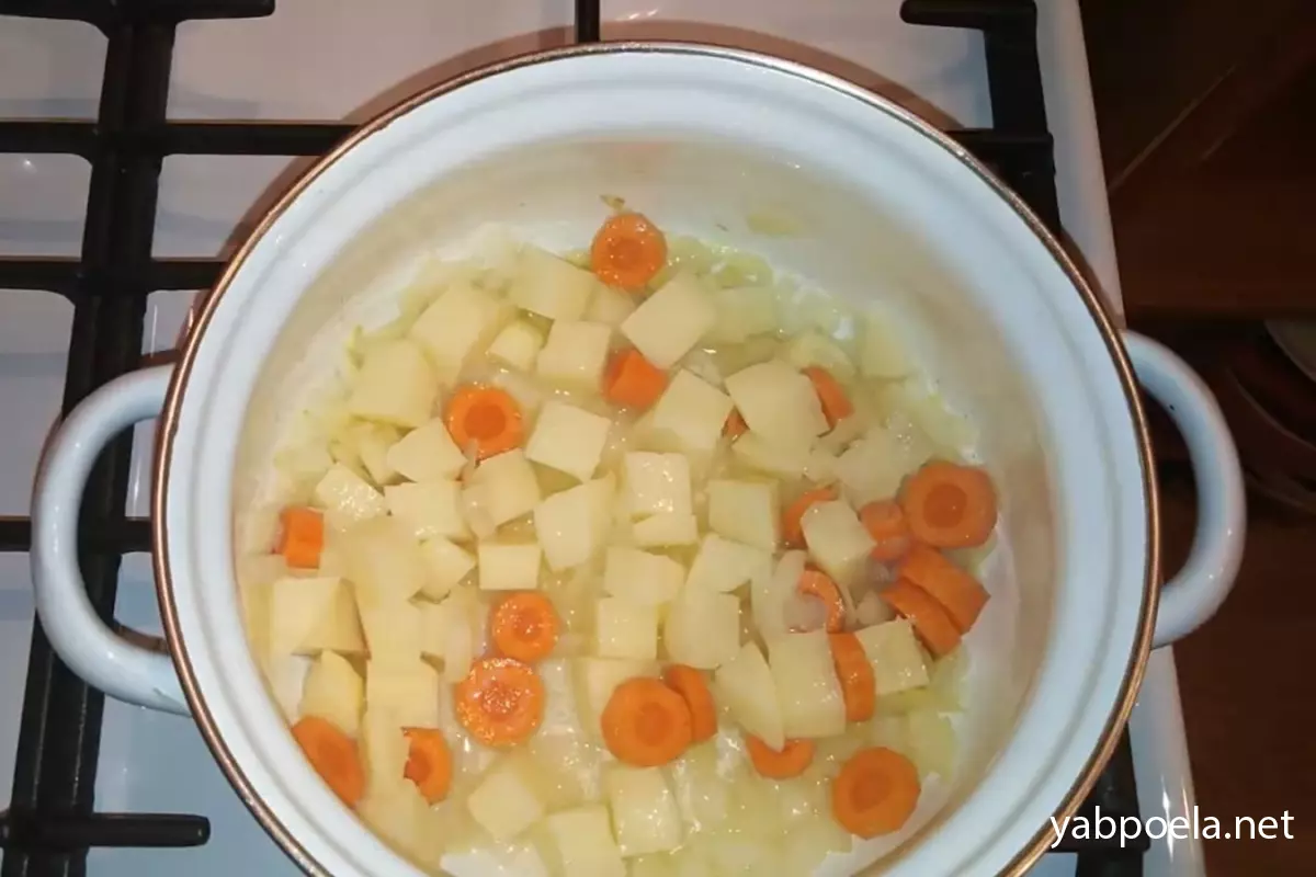 Додаємо до цибулі моркву й картоплю. Перемішуємо, накриваємо кришкою й даємо овочам потомитися на середньому вогні близько 5–7 хвилин. Не забувайте помішувати, щоб не пригоріло.