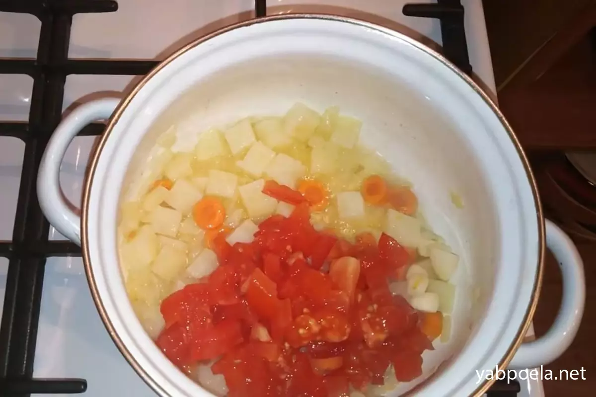 Часник нарізаємо крупно. Додаємо в каструлю часник і нарізаний помідор. Перемішуємо, знову накриваємо кришкою й тушкуємо ще 5–7 хвилин, щоб помідор дав сік і пом’якшав.