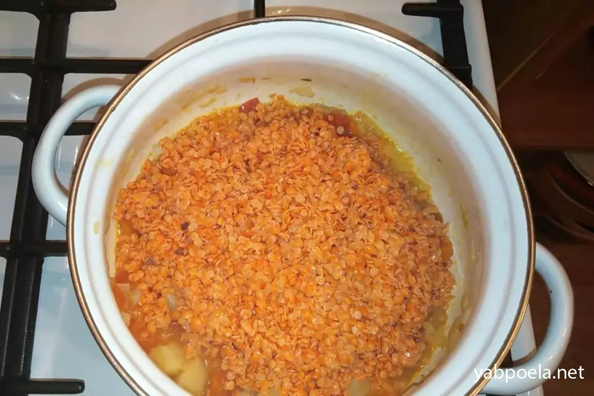 Заливаємо вміст 1 літром окропу. Перемішуємо. Варимо на помірному вогні під кришкою приблизно 20–25 хвилин. Червона сочевиця вариться дуже швидко й має добре розваритися.