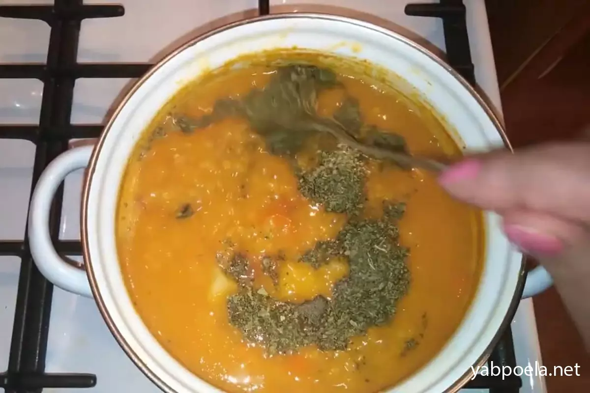 Коли сочевиця готова, додаємо сіль, чорний перець, чебрець і обов’язково сушену м’яту — вона головний секрет смаку цього супу. Даємо покипіти зі спеціями 2 хвилини й знімаємо з вогню.