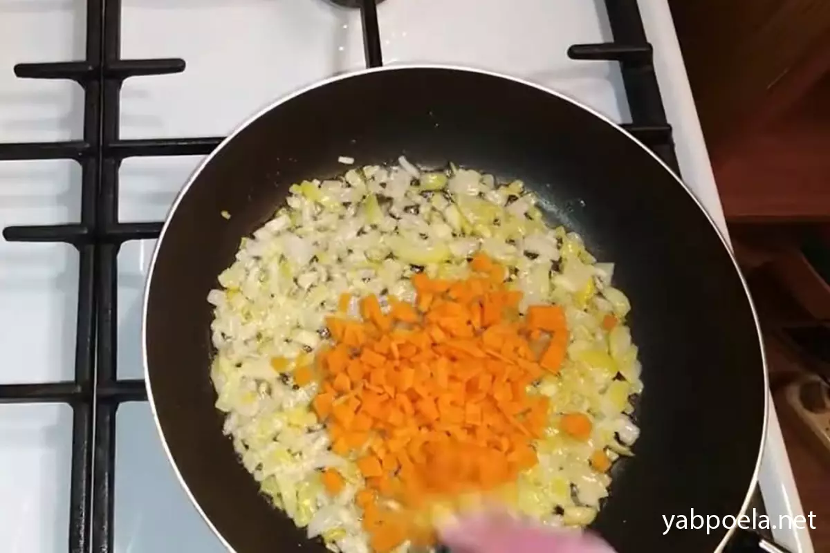 Готуємо засмажку. На розігріту сковороду з олією (3 ст. л.) викладіть цибулю. Обсмажуйте до золотистого кольору. Потім додайте моркву, перемішайте та смажте ще 3–4 хвилини.