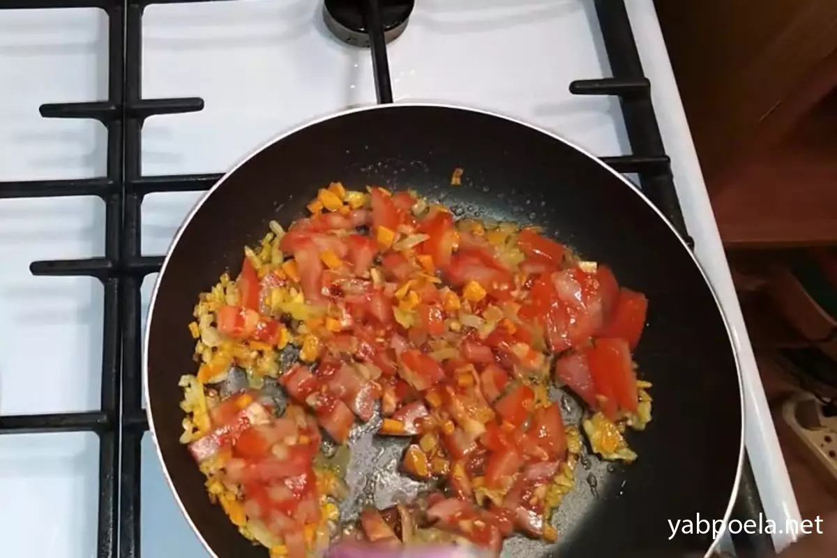 Додайте до цибулі та моркви нарізаний помідор. Постійно помішуючи, обсмажуйте, поки помідор не стане м'яким ("усмажиться").