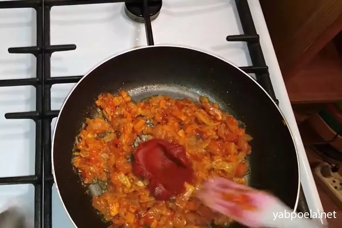 Додайте в засмажку 0.5 ст. л. томатної пасти. Перемішайте та обсмажуйте ще 3 хвилини. Це потрібно, щоб паста стала яскравішою і пішла зайва кислота. Зніміть засмажку з вогню.