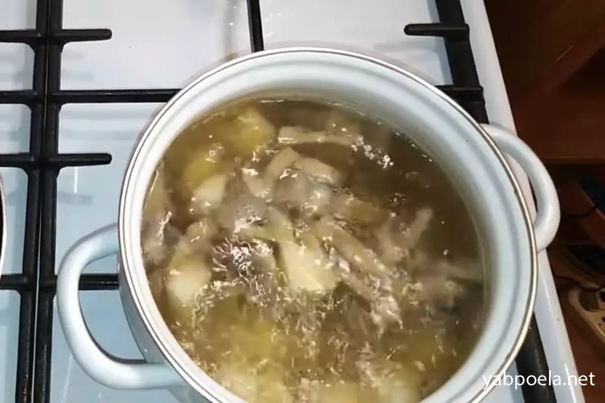 До цього часу гриби вже прокипіли 15 хвилин. Відправте в каструлю до грибів нарізану картоплю. Посоліть за смаком. Варіть до напівготовності картоплі (коли їй залишиться варитися хвилин 5).