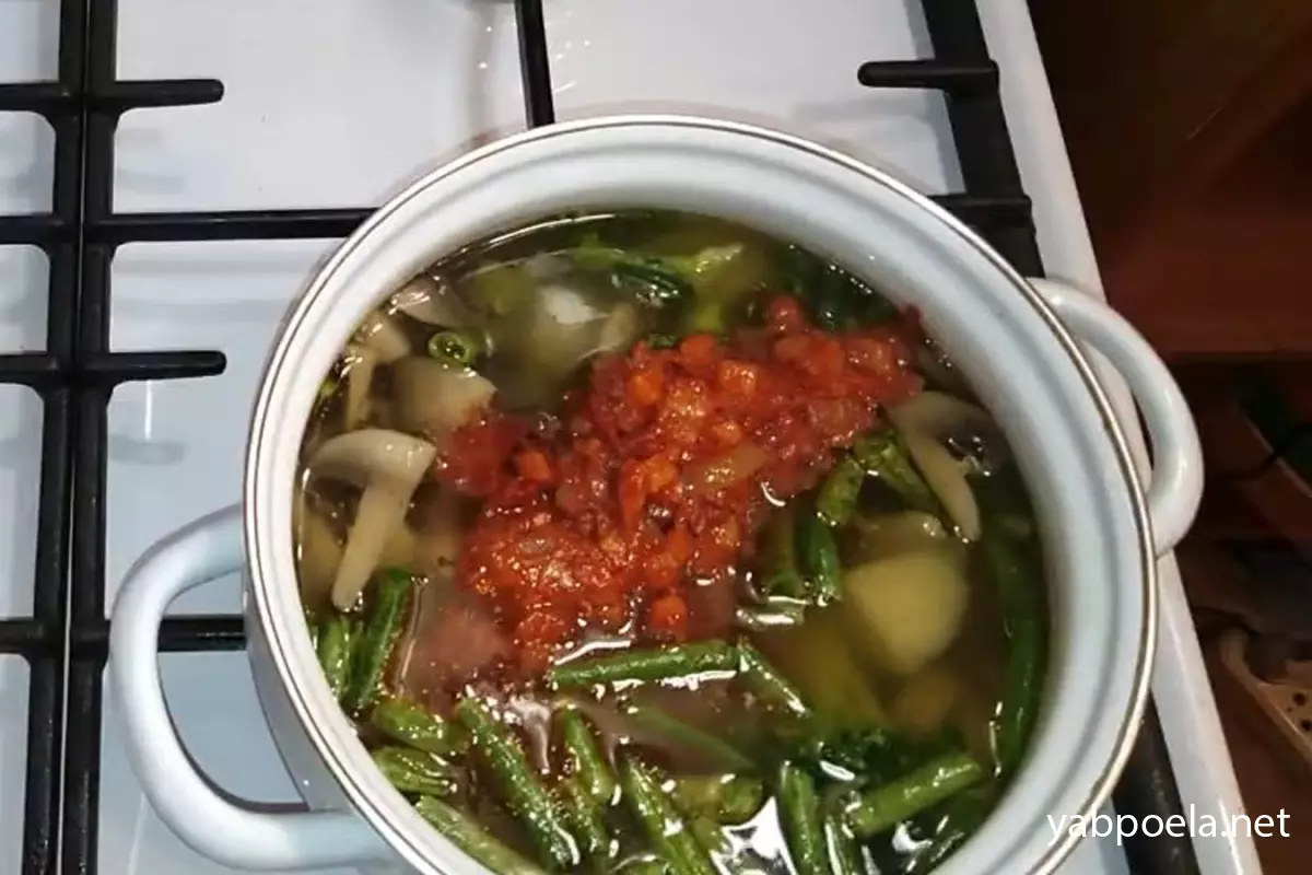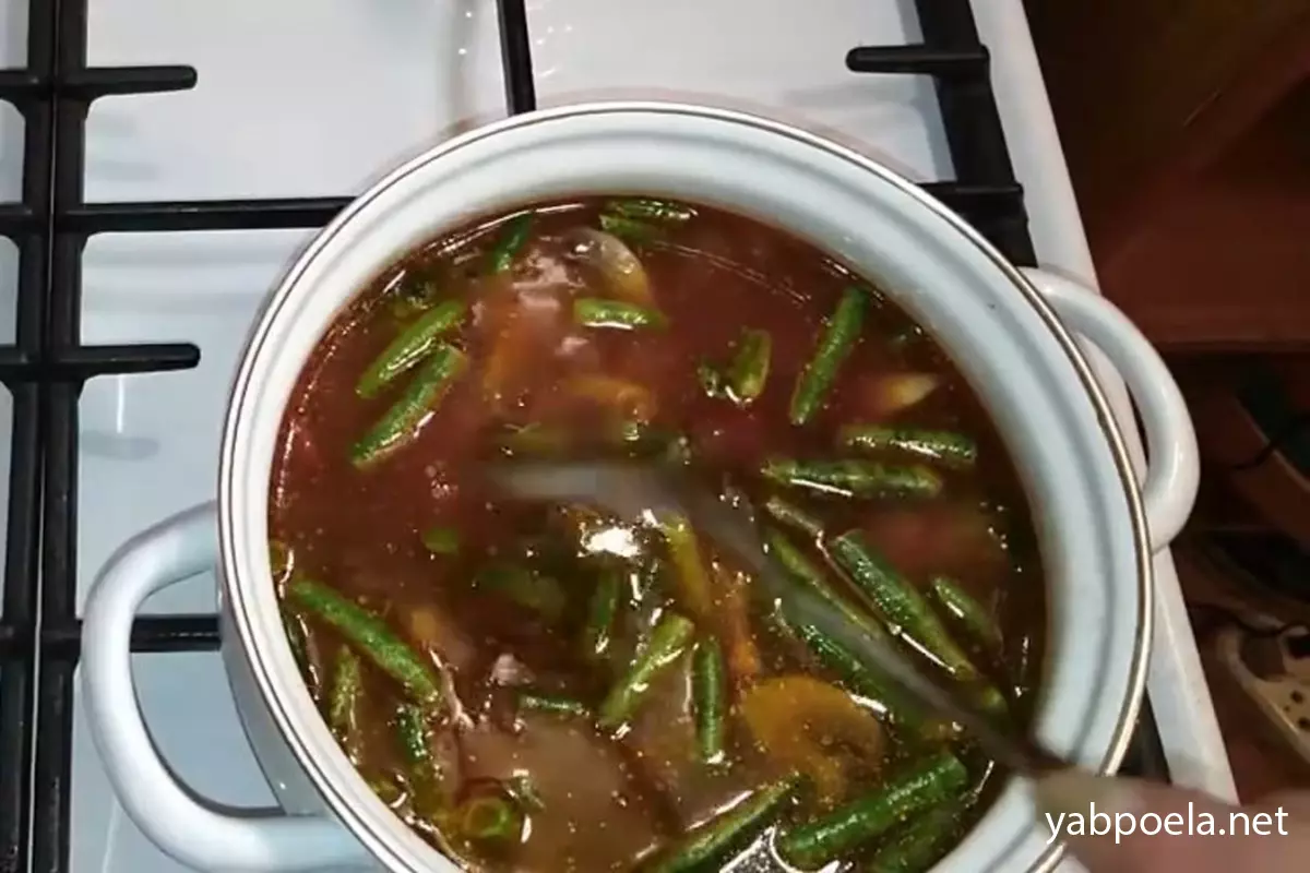 Коли картопля майже готова, додайте в суп заморожену стручкову квасолю та броколі (попередньо розморожувати не потрібно). Відразу ж перекладіть у каструлю готову овочеву засмажку.