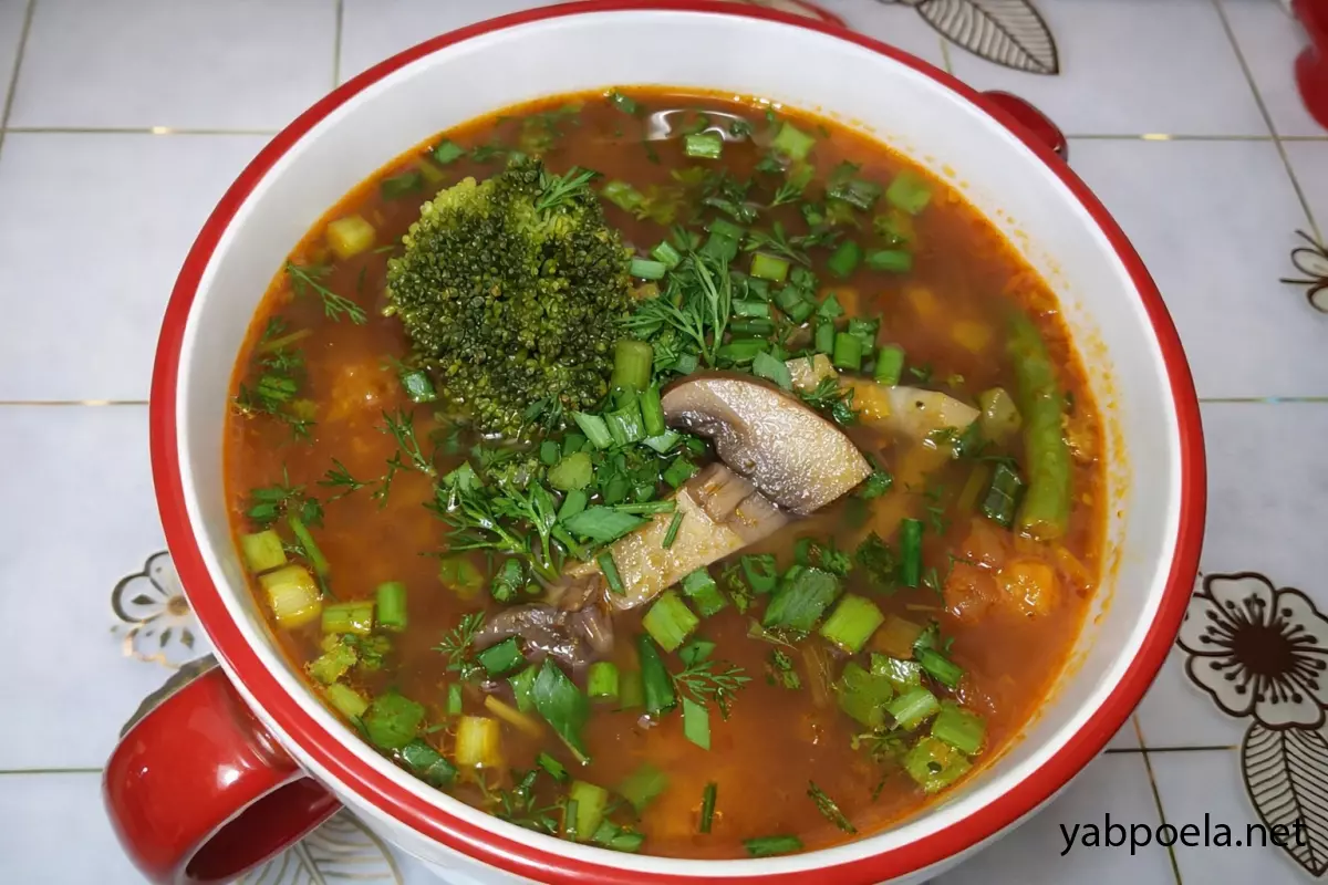 Пісний овочевий суп з броколі, грибами та стручковою квасолею